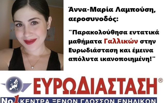 Άννα-Μαρία ΛαμπούσηΣπουδάστρια Γαλλικών Παρακολούθησα μαθήματα Γαλλικών στην Ευρωδιάσταση Ελληνικού / Νοτίων Προαστίων και έμεινα πολύ ευχαριστημένη από το πρόγραμμα, τους καθηγητές και τη γραμματειακή υποστήριξη του φροντιστηρίου. Πολύ εξυπηρετικό επίσης το γεγονός ότι η Ευρωδιάσταση βρίσκεται ακριβώς μπροστά στο metro του Ελληνικού.
